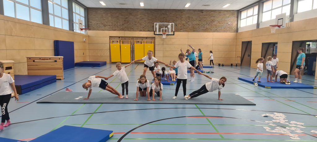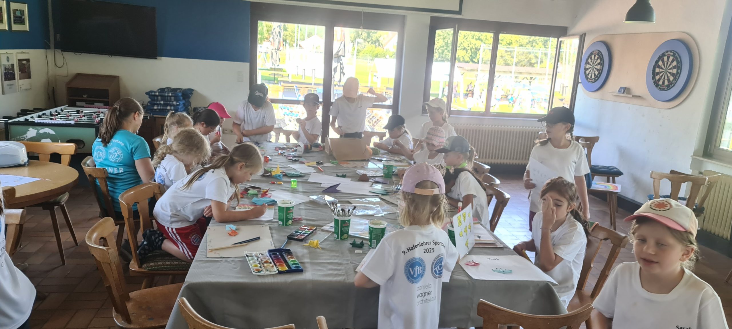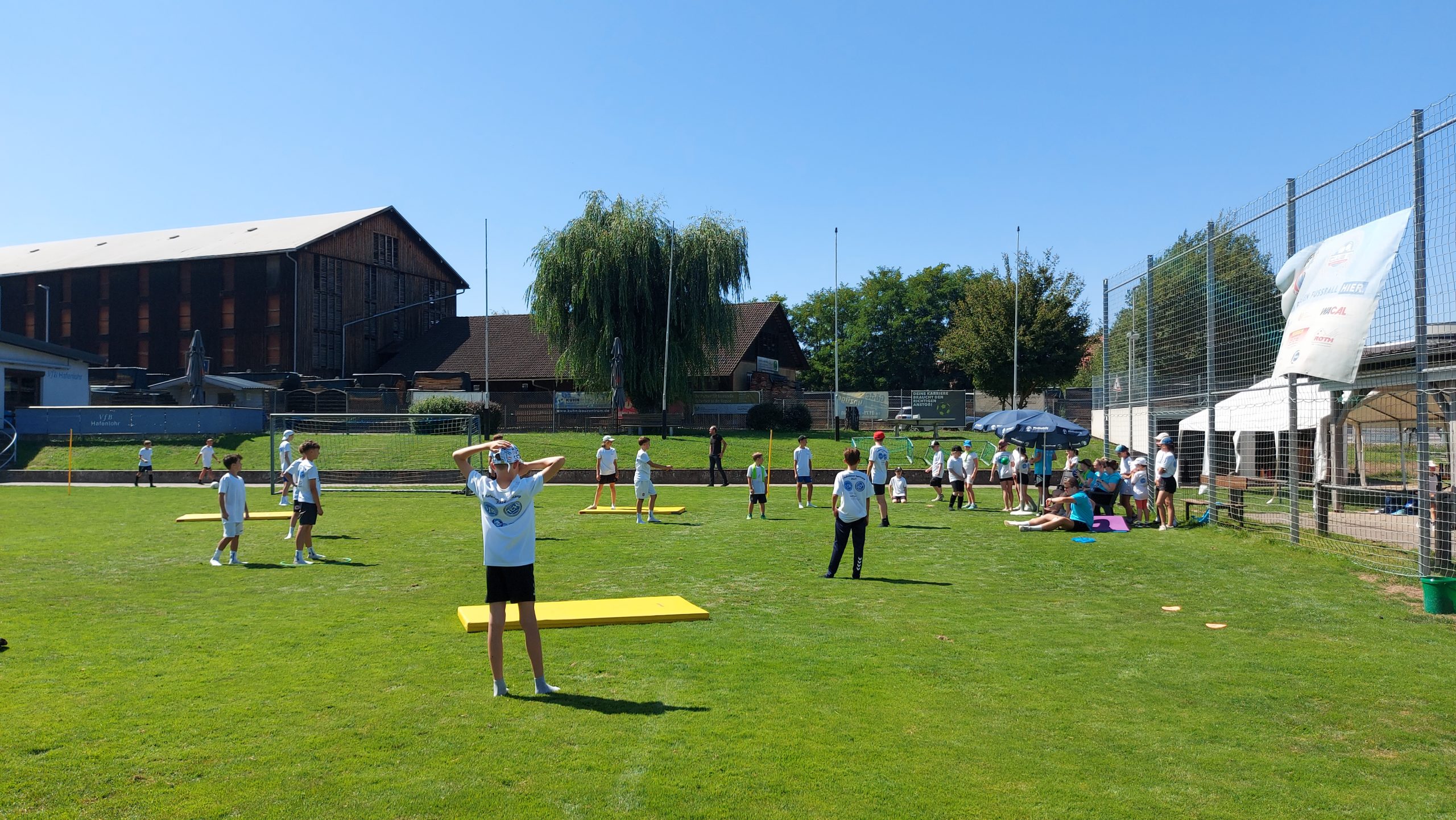 Nach dem gemeinsamen Aufwärmen um 9 Uhr startete der Donnerstag mit Tennis, Fußball, Volleyball und Turnen. Letzteres fand in der Hafenlohrer Sporthalle statt – dort wurden beeindruckende Menschenpyramiden gebaut, kleine Zirkus- und Akrobatikeinlagen geübt und so manches Kind entdeckte dabei ungeahnte Balancetalente. Am Sportplatz sorgte der legendäre Handstand-Wettbewerb zwischen Trainern und Kindern für Aufsehen – Trainer Tizi hielt tapfer durch, musste aber danach erstmal tief durchatmen.