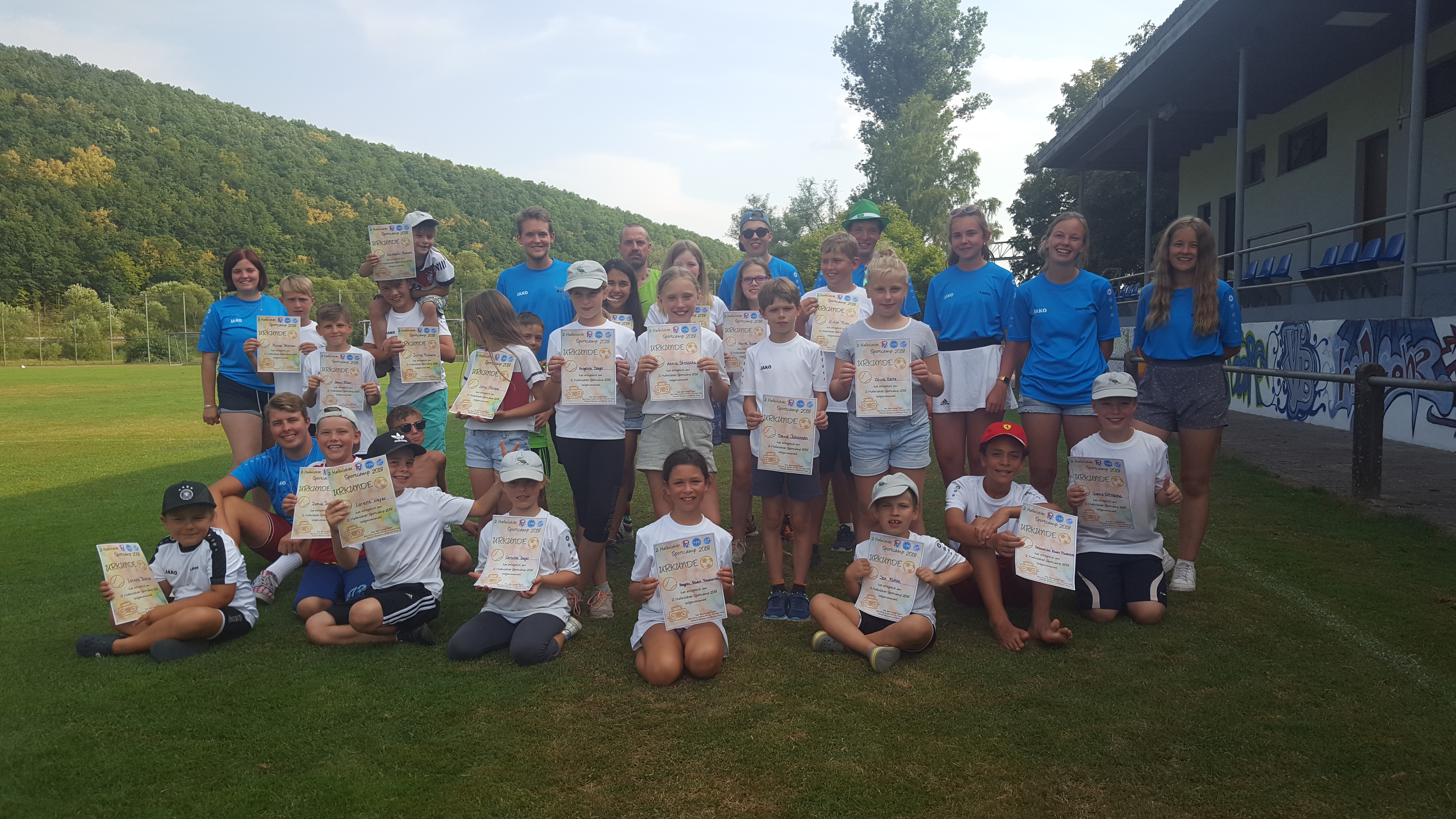 Für die letzten 2,5 Stunden des Camps – von 13:30 bis 16 Uhr – waren donnerstags und freitags dann noch Team-, Koordinations- und Konditionsspiele am Sportplatz für alle Teilnehmer angesagt, nun getrennt nach Altersgruppen, um die Teilnehmer der Sportarten zu mischen. Der Samstag wurde zum Highlight des Camps. Hier fand nach der Mittagspause eine Schatzsuche für alle Kinder zum Windheimer Spielplatz statt. Nachdem der Schatz, bestehend aus Wassereis, gefunden wurde, sorgten die Betreuer mit einer Wasserschlacht mit Wasserbomben und Spritzpistolen bei heißen 34 Grad für eine Abkühlung. Nach der Wiederankunft am Sportplatz begann der bunte Abend mit vielen Eltern, kühlen Getränken und einem Grill. Das geplante Lagerfeuer musste leider aufgrund der Trockenheit und des heißen Wetters ausfallen. Ungefähr die Hälfte aller Kinder meldete sich noch zusätzlich für die Übernachtung im Zelt am Sportplatz von Samstag auf Sonntag an. Auch hier gab es abends noch ein paar Highlights, wie beispielsweise Fußball im Halbdunkeln oder Betreuer gegen Kinder im Völkerball. Am Sonntag kamen nach einem reichhaltigen Frühstück wieder alle anderen Kinder um 9 Uhr für den Abschlusstag hinzu, der wiederum mit Spiel und Spaß gefüllt und mit der Urkundenverleihung abgeschlossen wurde.