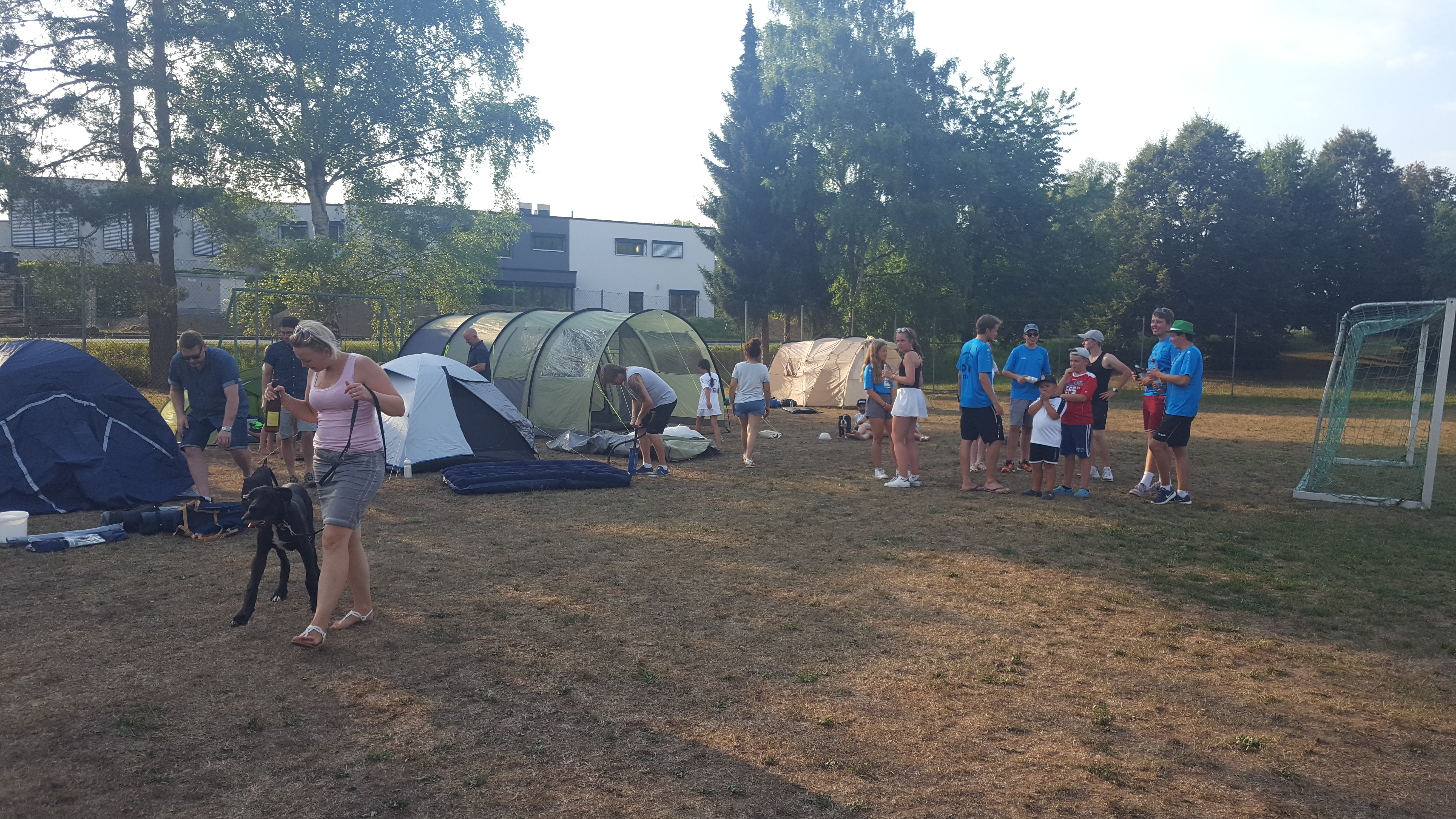 Für die letzten 2,5 Stunden des Camps – von 13:30 bis 16 Uhr – waren donnerstags und freitags dann noch Team-, Koordinations- und Konditionsspiele am Sportplatz für alle Teilnehmer angesagt, nun getrennt nach Altersgruppen, um die Teilnehmer der Sportarten zu mischen. Der Samstag wurde zum Highlight des Camps. Hier fand nach der Mittagspause eine Schatzsuche für alle Kinder zum Windheimer Spielplatz statt. Nachdem der Schatz, bestehend aus Wassereis, gefunden wurde, sorgten die Betreuer mit einer Wasserschlacht mit Wasserbomben und Spritzpistolen bei heißen 34 Grad für eine Abkühlung. Nach der Wiederankunft am Sportplatz begann der bunte Abend mit vielen Eltern, kühlen Getränken und einem Grill. Das geplante Lagerfeuer musste leider aufgrund der Trockenheit und des heißen Wetters ausfallen. Ungefähr die Hälfte aller Kinder meldete sich noch zusätzlich für die Übernachtung im Zelt am Sportplatz von Samstag auf Sonntag an. Auch hier gab es abends noch ein paar Highlights, wie beispielsweise Fußball im Halbdunkeln oder Betreuer gegen Kinder im Völkerball. Am Sonntag kamen nach einem reichhaltigen Frühstück wieder alle anderen Kinder um 9 Uhr für den Abschlusstag hinzu, der wiederum mit Spiel und Spaß gefüllt und mit der Urkundenverleihung abgeschlossen wurde.